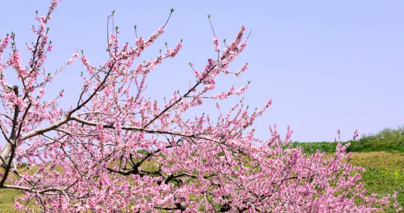 この時期の雪解け水を「桃花水」とよ呼ぶ。コンビニで売っているペットボトルにも「桃」を使った飲料水があるし、この時期は梅と並んで、桃の花も見ごろ。果物の桃が出回るのは、もう少しあと。
